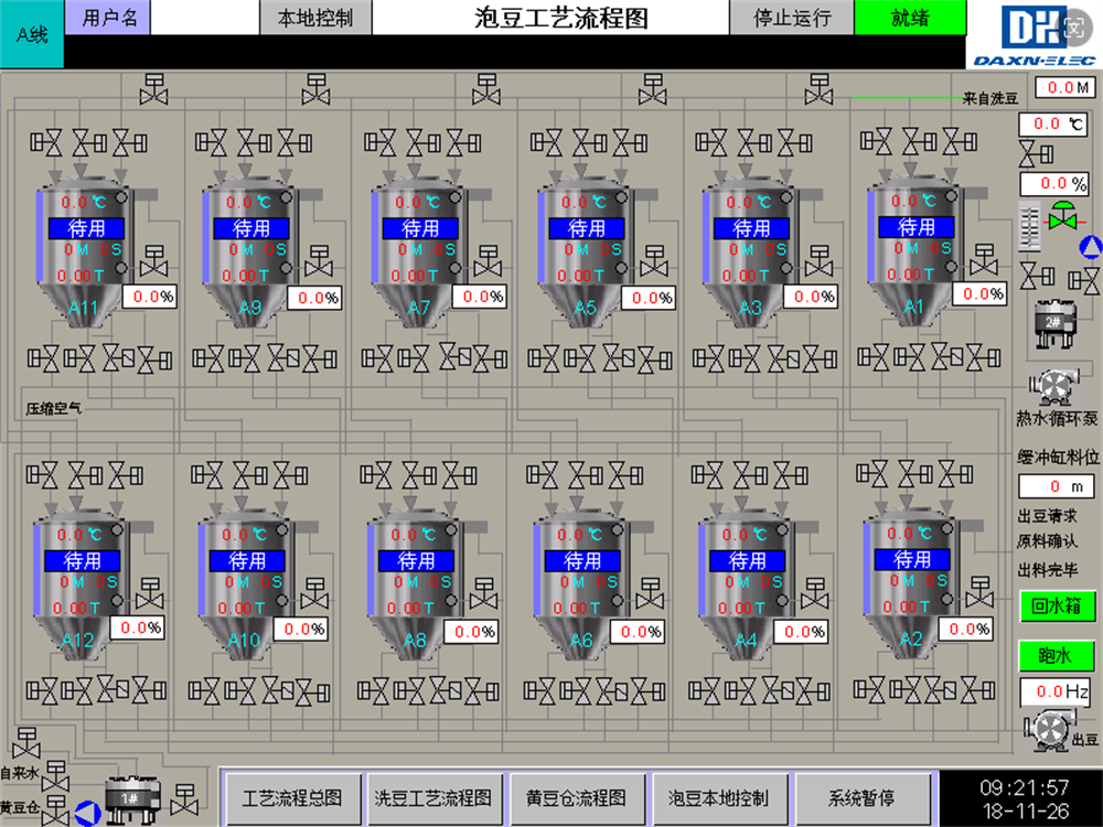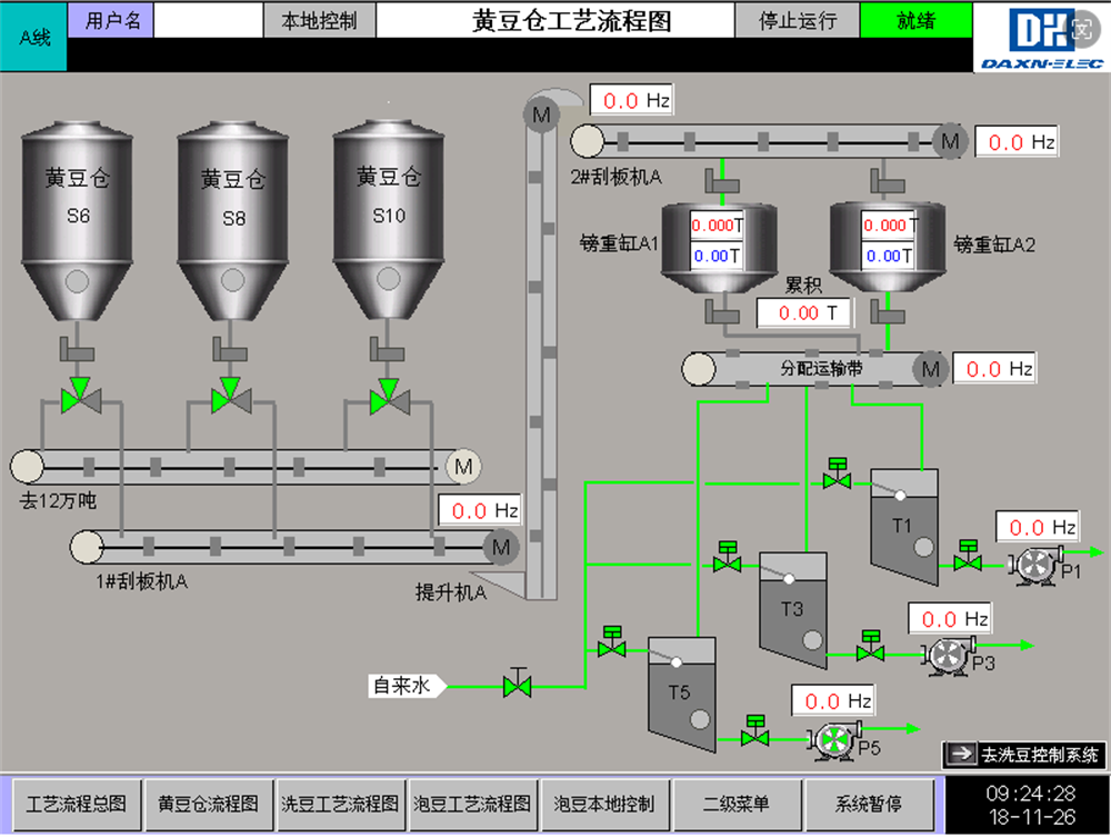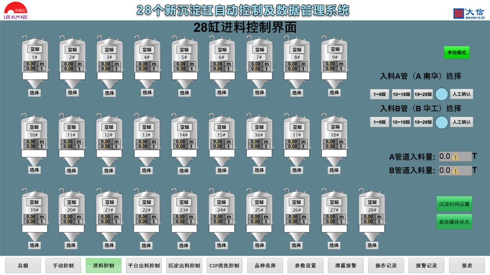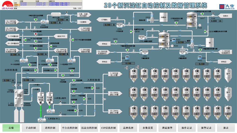 沉淀缸自动控制及数据管理系统主要由四个系统组成,沉淀缸底部出料系统、沉淀缸平台出料系统、沉淀缸入料系统以及CIP清洗系统。