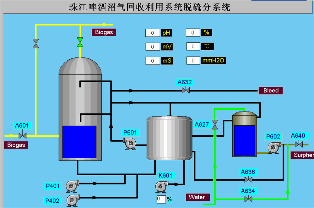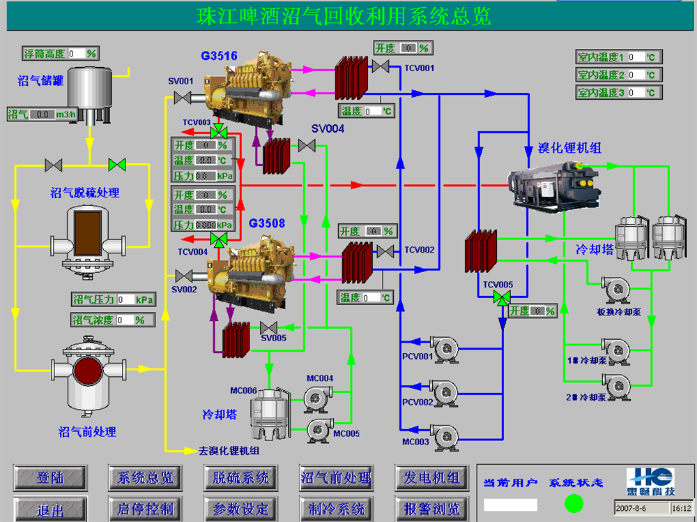 该画面显示了整体工艺流程,包含了一些主要的信息,例如脱硫系统、前处理系统、发电机组、冷却系统的运行情况等。粉色管道为沼气,黄色管道为烟气、红色管道为热水、绿色和蓝色管道为冷水。阀门关闭为灰色,开启为绿色,故障为红色。脱硫系统如果启动,在代表脱硫系统的罐体上将有动画水滴落下;前处理系统和发电机组、泵等如果启动,在相应的位置会出现转动的风轮;如果发生故障,相应的对象将变成红色,以示报警。鼠标移动到相应的对象上时,可以进行点击,将进入相应的分系统。